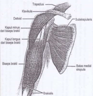 M. Triseps Braki (Otot Lengan Berkepala Tiga), Kepala luar berpangkal disebelah belakang tulang pangkal lengan dan menuju ke bawah kemudian bersatu dengan yang lain, kepala dalam dimulai disebelah dalam tulang pangkal lengan, kepala panjang dimulai pada tulang di bawah sendi dan ketiganya mempunyai sebuah urat yang melekat di olekrani